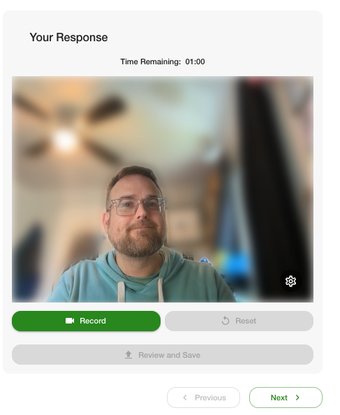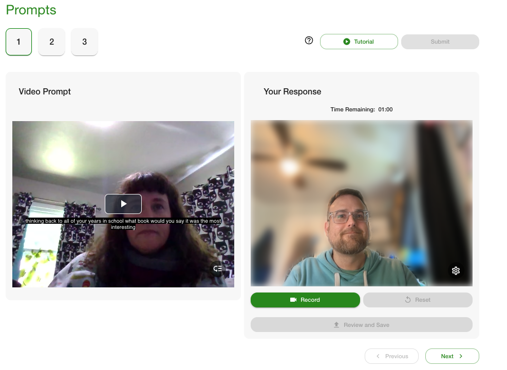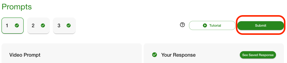 Please Note: Before you submit your responses, you can navigate through each response using the buttons on the top left of the Prompts page or the Previous and Next buttons below your video recording. From there you can review past responses and record new ones.