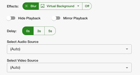 4. Check your camera and microphone sources and test. Click the Gear icon in the bottom right of your video to update the camera effects, playback, delay, audio source, and video source.